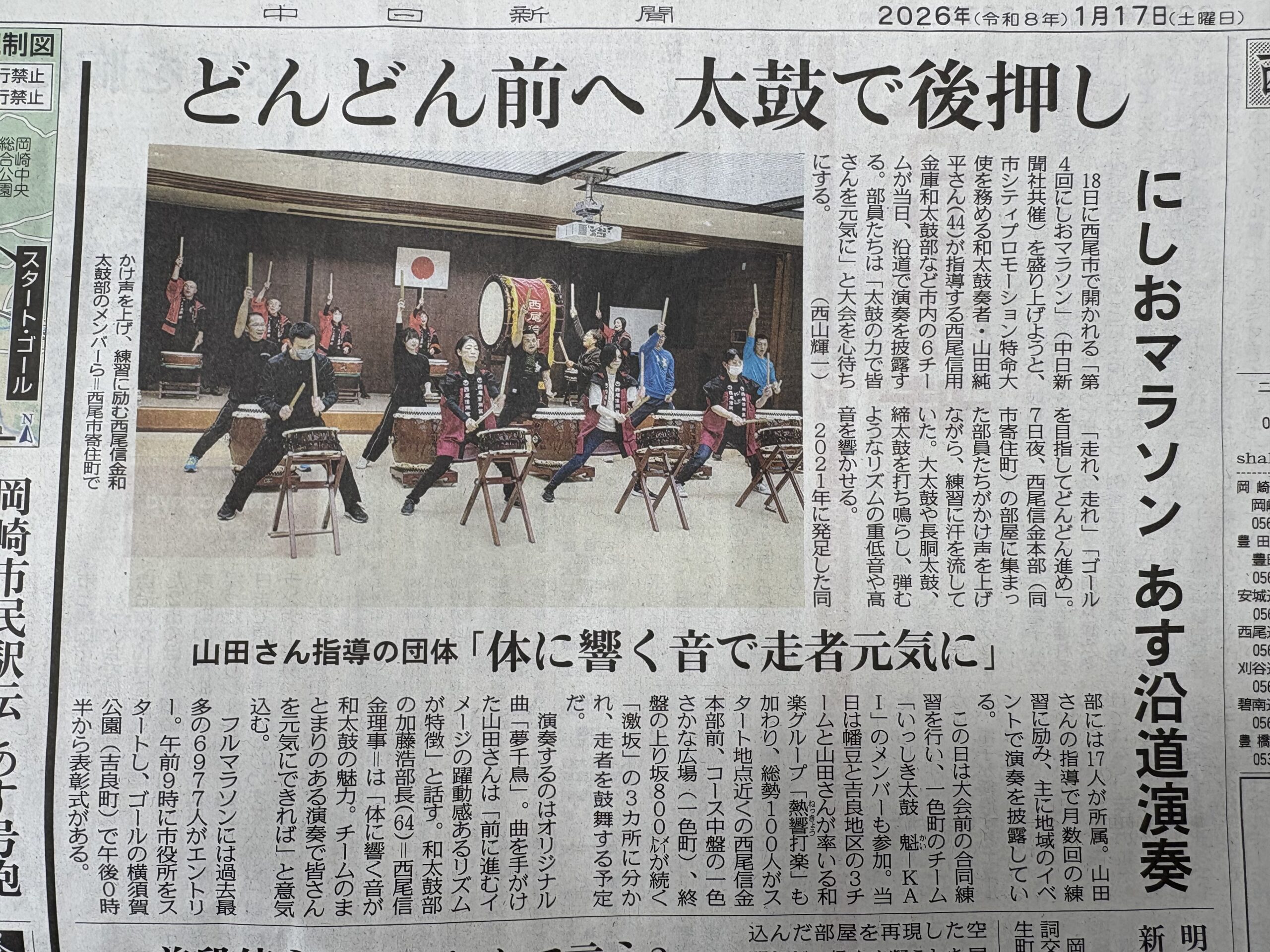明日は西尾市が総力をあげて開催するフルマラソン大会。スタート地点から沿道まで太鼓の音が鳴り響きます。