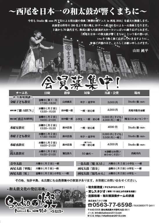 Studio燦-sun-に所属する17チーム、友情出演の一色高校和太鼓部「いっしき」、