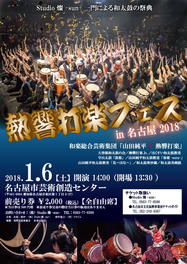 名古屋ブロックで活動する、Studio燦門下生による和太鼓の祭典「熱響打楽フェスin名古屋2018」を盛大に開催します。皆様ご声援のほど、よろしくお願い致します。